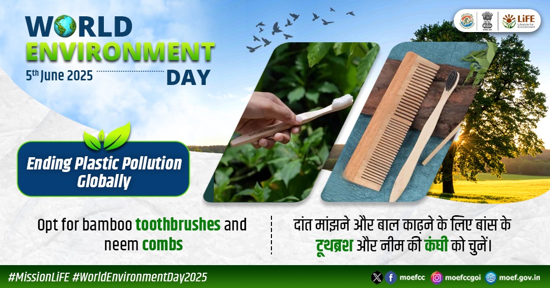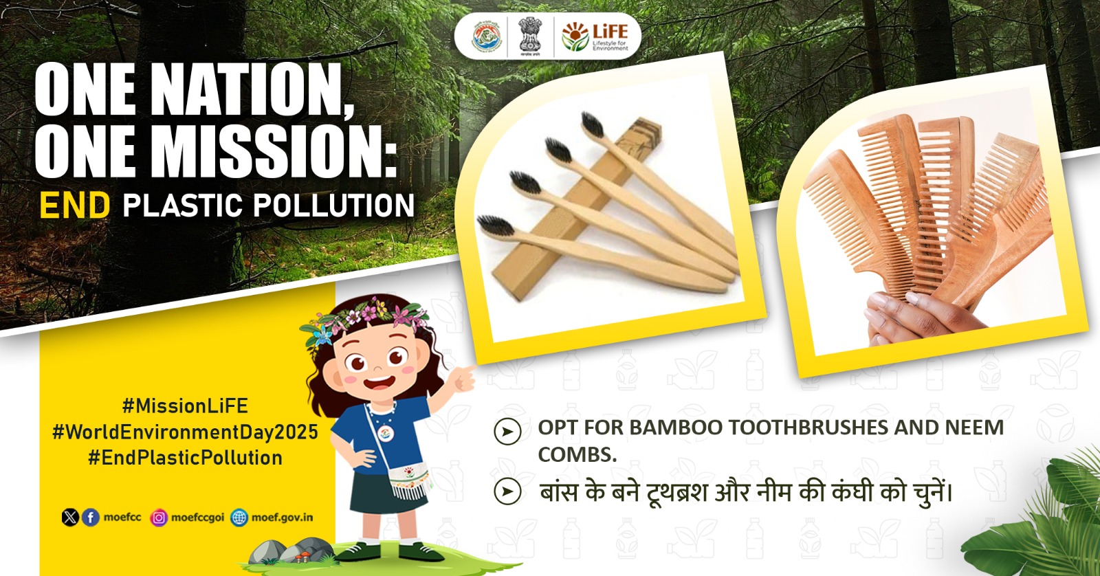 Opt for bamboo toothbrushes and neem combs. Everyday, choices like these go a long way in ending plastic pollution. #MissionLiFE #WorldEnvironmentDay2025 #EndPlasticPollution